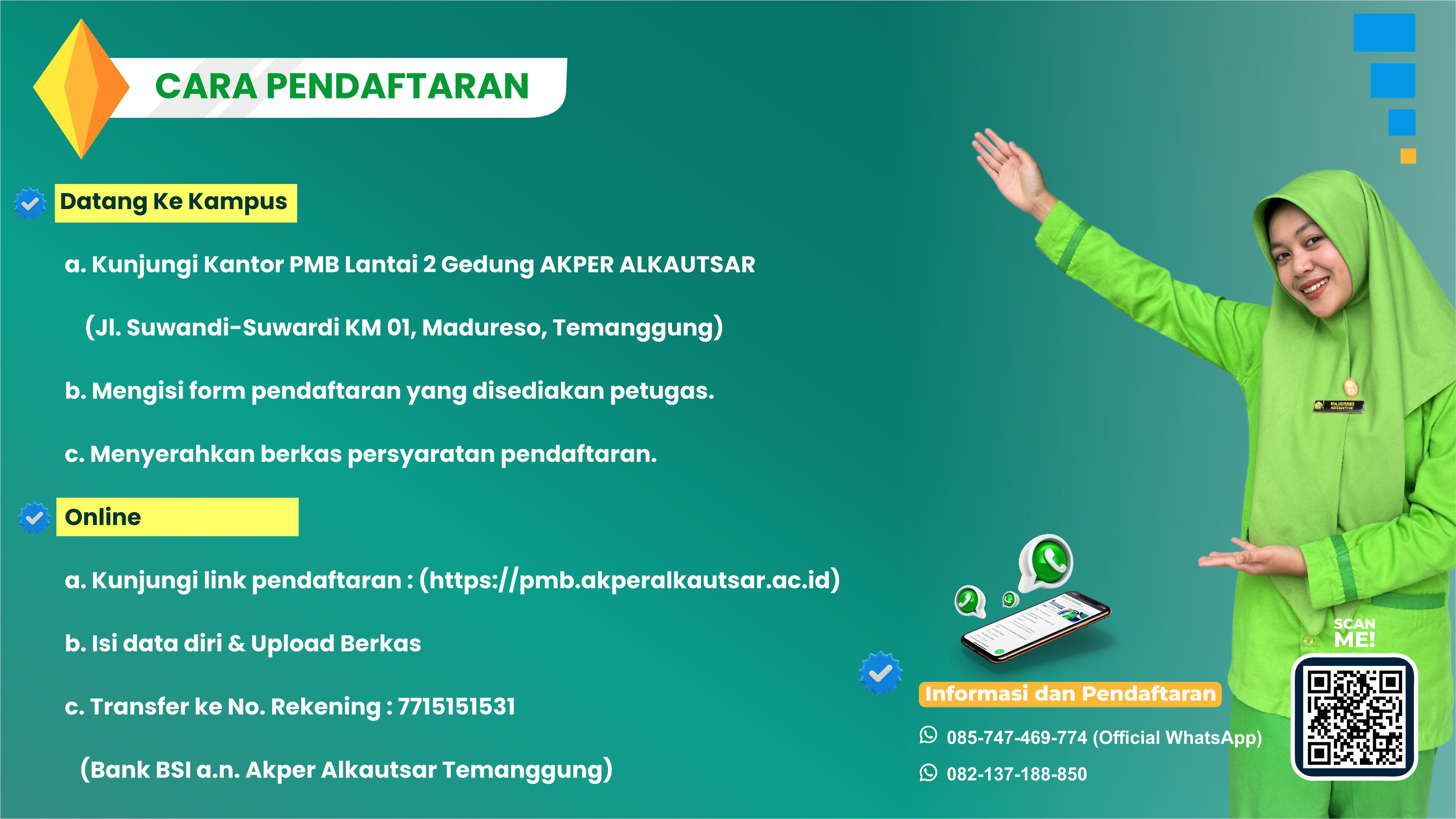 AKPER ALKAUTSAR TEMANGGUNG menyediakan PMB secara online diharapkan proses PMB dapat berjalan cepat dan bisa dilakukan dimanapun dan kapanpun selama sesi PMB Online dibuka. AKPER ALKAUTSAR TEMANGGUNG.